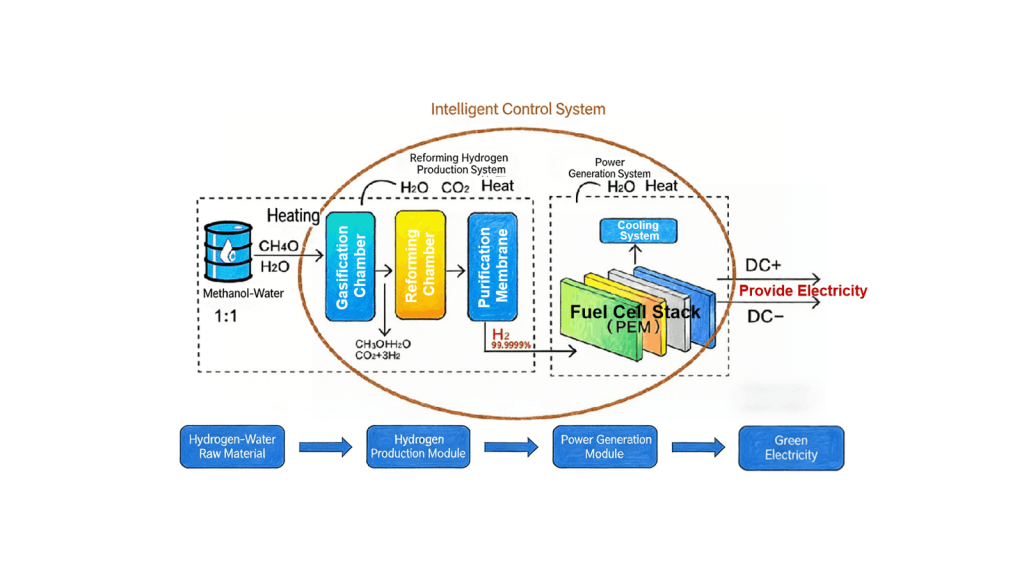 The Methanol-Water-Hydrogen Generator is an integration of two systems: methanol-water steam reforming for hydrogen production and proton membrane-based power generation. It enables on-demand, on-site hydrogen production and electricity generation within a single device, eliminating the need for hydrogen storage.