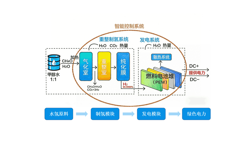 水氢机是甲醇水蒸汽重整 制氢和质子膜发电双系统的整合 体,实现了在同一设备中可移动 即时制氢和发电,无需存储氢气。